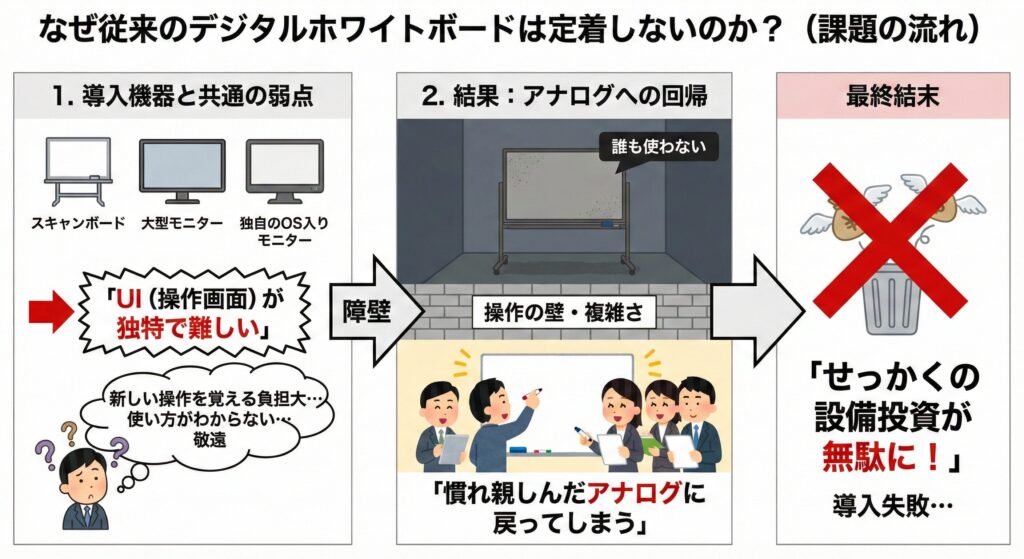 「使いこなせない」という理由で結局アナログなホワイトボードに戻ってしまうケースが後を絶ちません。